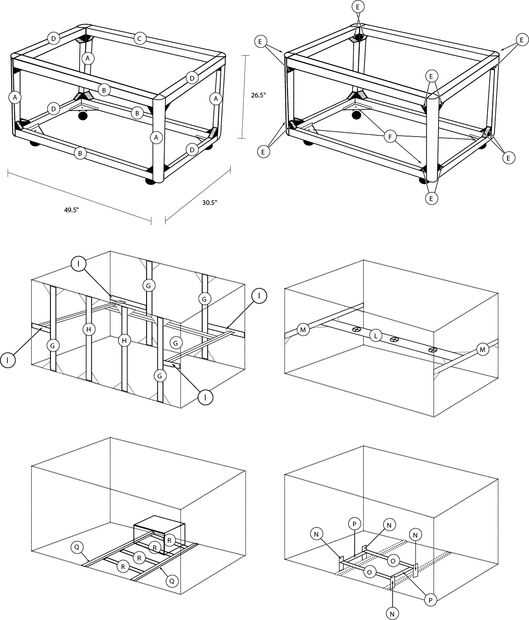 Deberá referirse al dibujo y diagrama para armar el marco del puntal. El puntal gráfico mostrará grueso, longitud, cantidad y una carta de parte. Utilizar la carta de la parte y el diagrama para saber que pieza va donde. No coloque los ensamblajes de rueda hasta que el panel inferior.