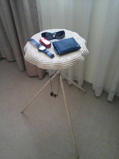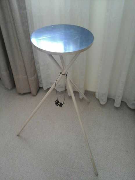 Esta mini mesa unicamente esta diseñada para sostener objetos pequeños y de uso diario (llaves, gafas, celular, billetera, etc.), objetos de bolsillo traductor un lugar especial y unico facil de localizador. La resistencia del mismo esta dada por los "palos" o vigas que lo sostienen, en este caso aumentando vigas de 15mm de diametro. La estabilidad vendria de acuerdo a la disposicion (base de la apertura en) y dimensiones de las patas. Este diseño busco hacer algo funcional pecado mayores procesos de construccion, utizando materiales de supermercado y ferreteria de bajo costo.