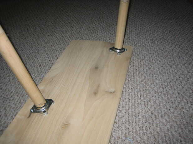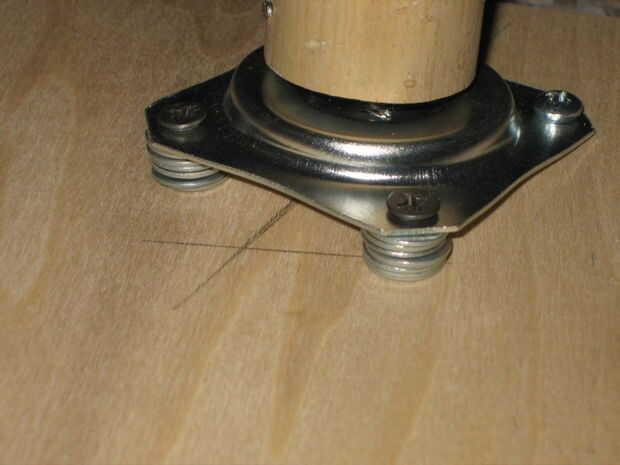Una vez la tapa de tabla es completa puede colocar la placa de tres montaje--uno en el centro de la parte posterior y en cada esquina frontal. Terminé comprando las placas de montaje recto, y luego usé pilas de arandelas para sacarlos a 15 grados del ángulo de la superficie de la parte superior. Este ángulo no es particularmente crítico. Tenga en cuenta que pata trasera es inclinada hacia atrás (es decir perpendicular al eje de la tabla) el punto, pero las patas delanteras señalan en sobre un ángulo de 30 grados desde el eje. Muy importante: Asegúrese de utilizar tornillos que sean lo suficientemente largos que todavía ir al menos a medio camino a través de la parte superior, pero no utiliza tornillos demasiado largos.