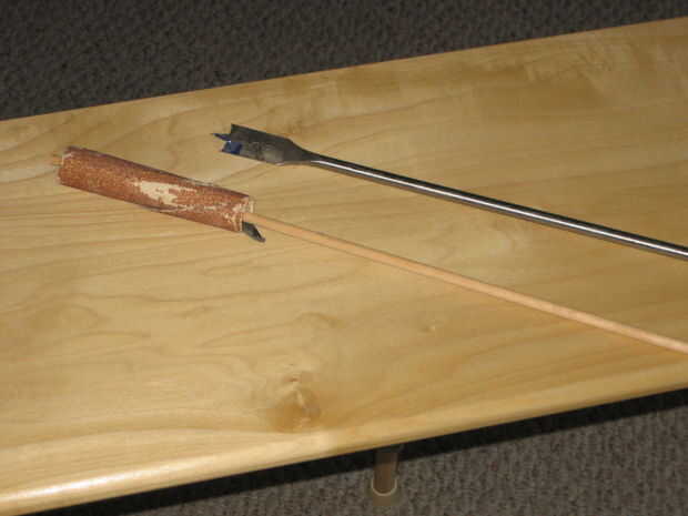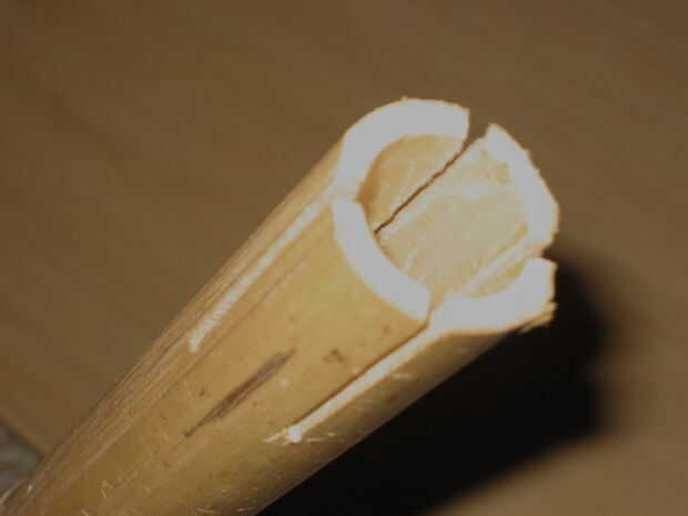 Primero, corté el bambú en tres pedazos aproximadamente 18" largo (yo cortado les hasta 16" más adelante). Como dije, use una sierra afilada y corte alrededor de la circunferencia para evitar el arranque. Si utiliza una caja de ingletes para hacer cortes rectos, tenga en cuenta que el bambú es afilado, así que tienes que elevar el extremo más pequeño ligeramente, sobre una mitad de la diferencia de diámetros. Es decir, si el extremo es 1" de diámetro y el extremo pequeño es 3/4", 1/2*(1-3/4) = 1/8 ". A continuación, sujete cada pieza firmemente y usar la broca larga 3/4" para limpiar el interior. No intente mantener el bambú en la mano cuando haces esto, el taladro puede enlazar inesperadamente. Utilizar el tambor de lijar que improvisado para limpiar cualquier asperezas en las ensambladuras del segmento.