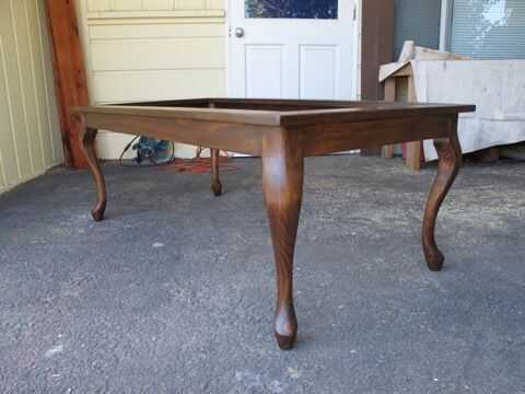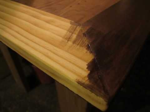 Una vez finalizado el montaje inicial de la tabla, lije hasta grano 220. Dar la mesa toda una toallita abajo con algunas bebidas espírituosas o alcohol desnaturalizado en un trapo. Se limpie cualquier polvo restante antes de comenzar la coloración. Tenga cuidado en las esquinas de la mesa... siempre mueva el cepillo en la dirección de la veta, a diferencia de mi error en la foto. Si no estás seguro de tu técnica de cepillo, no sería una mala idea usar cintas azules en las esquinas. Cinta fuera del área de en el interior del delantal donde las vigas de apoyo necesitan estar Unido (siguiente paso) para que el pegamento puede adherirse a la madera desnuda.