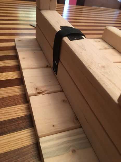 Coloque la correa en el exterior de la ayuda exterior. La correa debe ser lo suficientemente largos para alcanzar la pierna cuando está de pie hacia arriba y hacia el otro lado de la ayuda exterior. Montar el gancho de las piezas a las piezas de la pierna y exterior soporte como se muestra en la imagen.
