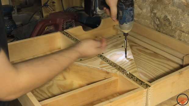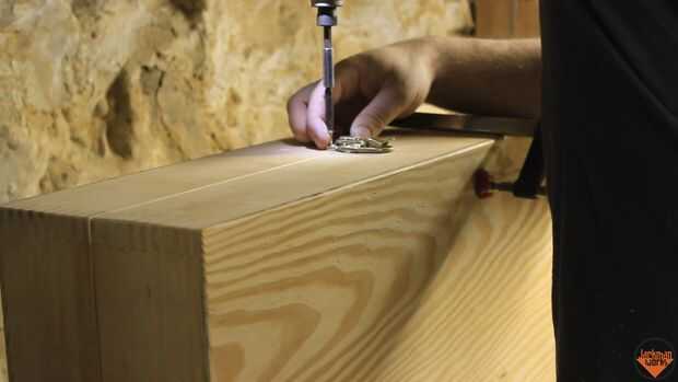 Se une el resto del hardware final. Un pestillo se agrega al exterior y los tornillos de la cabeza se instalan en el triángulo.
