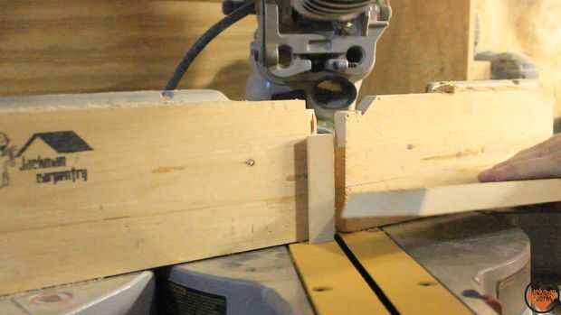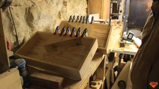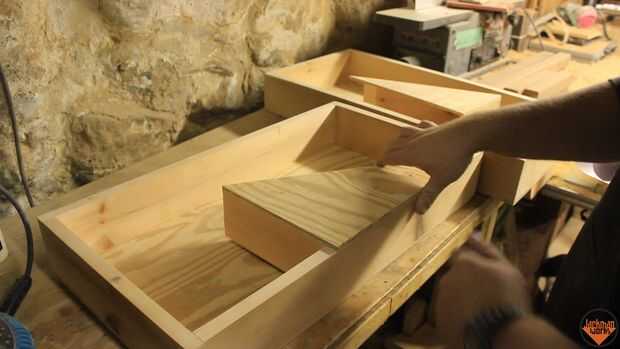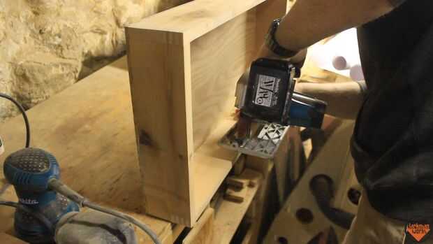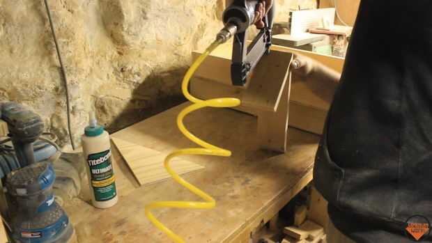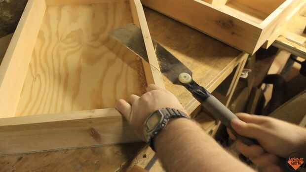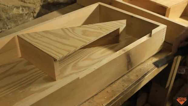 Cada lado de la caja necesita un dado para aceptar la superposición del triángulo. El triángulo se remonta hacia la caja y se corta usando una habilidad Sierra y Serrucho. Los triángulos son pegados y con tachuelas en el lugar y afianzado con abrazadera firmemente.