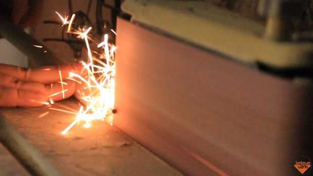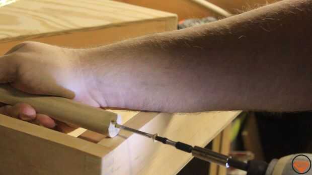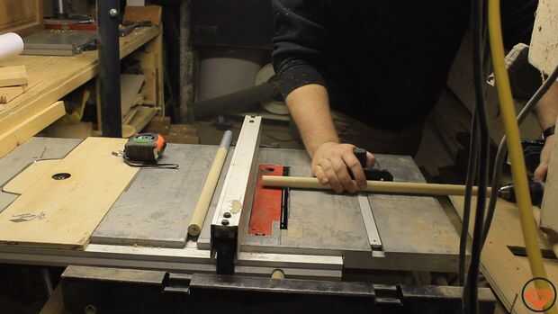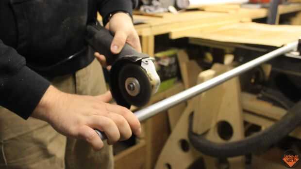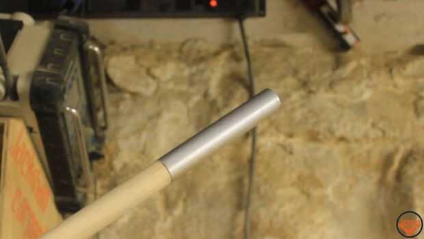 3/4" pieza de conducto eléctrico se corta como un acoplamiento entre las dos partes del poste. Entonces cada uno de los polos se afeita abajo para caber en el tubo con la Sierra de mesa y conectarlo al taladro en un extremo con un tornillo al girar.