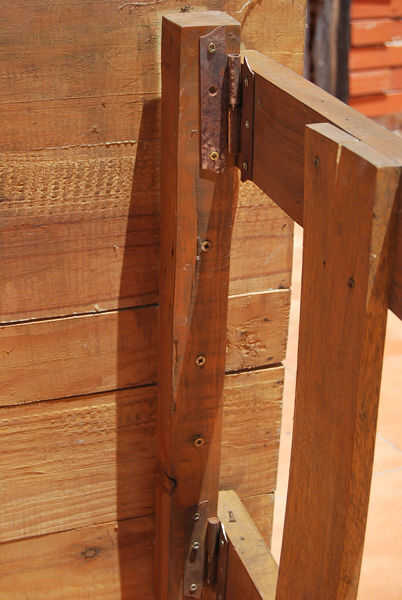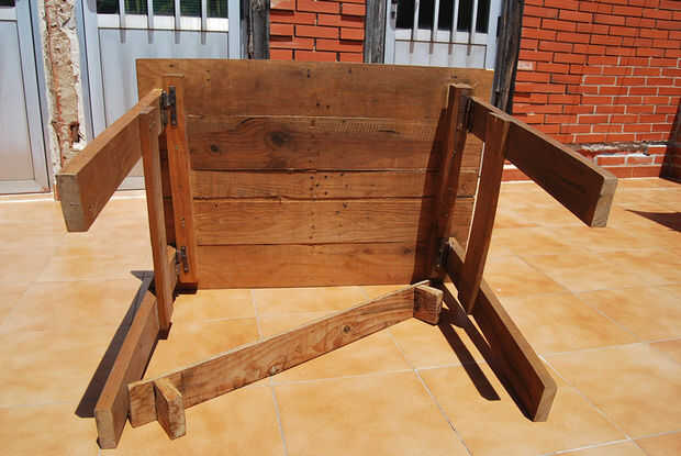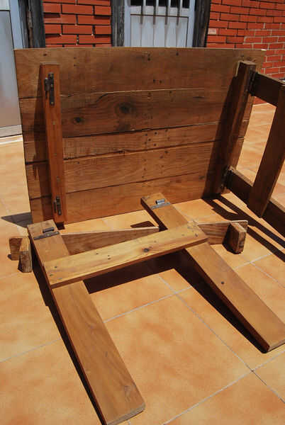Para hacer las patas, se hacen dos H de madera. Asi de sencillo. Pero hay truco. Mesa de la de la tablero "el soportando si ponemos las patas", y al lado de los postes, ponemos las bisagras a la altura "pide" la pata. De esta forma la pata hace tope en el largero, es decir, no se podra abrir mas los 90 º tiene en este momento.