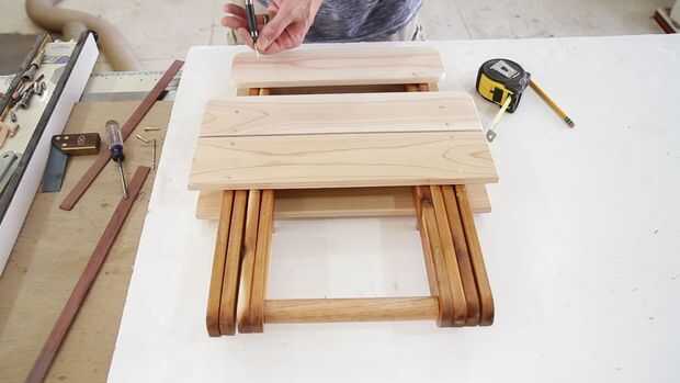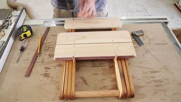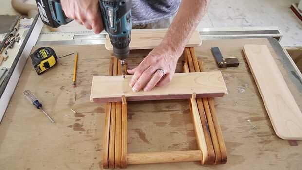 Voltee la tabla y repita el proceso. La única deferencia es que atornillar las piezas a los soportes exterior y fuera de las piernas.