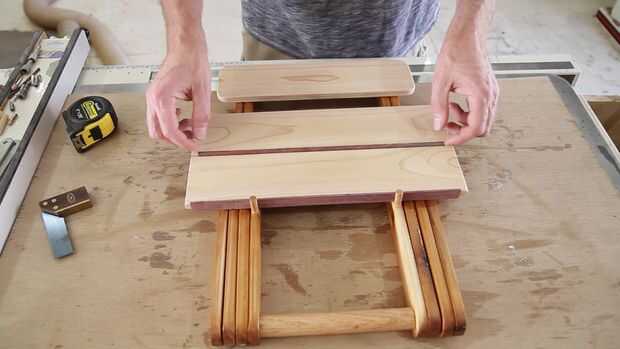 Plaza de las dos piezas principales para arriba. Usé a un espaciador de 1/8" entre las espigas y dos piezas. Utilice una cinta métrica para medir el voladizo a cada lado. Pre perforación para los tornillos, utilicé un cuadrado a la línea de los apoyos. Tornillo 15 1/4" piezas en el interior de la ayuda con las paradas de la espiga. El soporte inferior se atornilla en el interior de la pierna 1/5 de 1" abajo de la pieza superior.