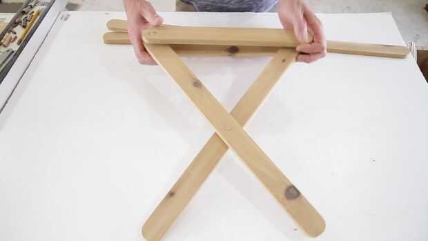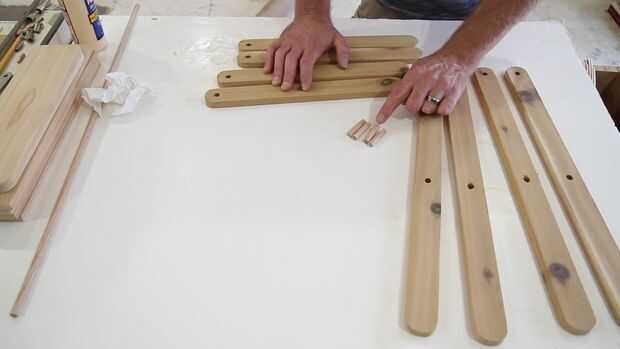 Pegamento en las espigas de 3/4" a 14" pieza que ha perforado un orificio de 5/8 en el borde. Los 2" tacos, se pegan en la 20 1/2" piezas. Adhiera 1 1/8" a 14" soportes. (No la que tienen las espigas de 3/4") Deje que el pegamento seque antes de Asamblea. Las piernas de 20 1/2" ir en la parte exterior de los soportes de 14" con los tacos de parada 3/4". Los soportes del 14" van en el exterior de la otra 1/12 de 20" pierna. Los dos últimos 1 1/8" tacos, se pegan a la 20 1/2" pieza de la cruceta, pegarlos en el exterior de la pierna.