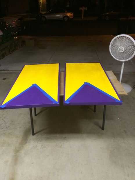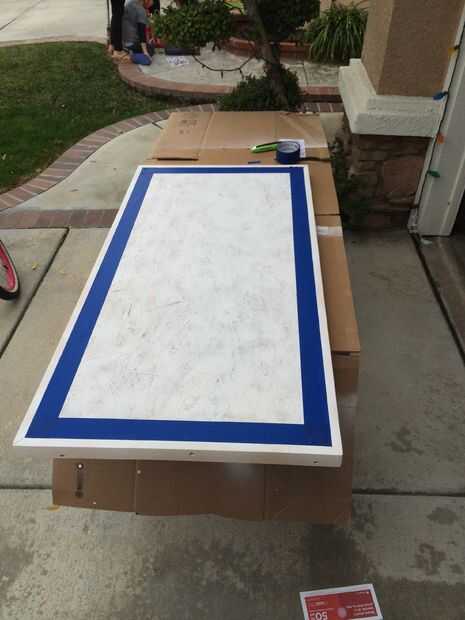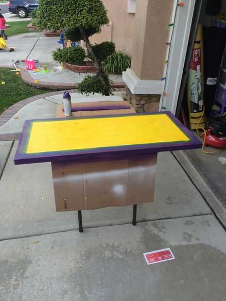 encontré Lakers púrpura y amarillo y mi local Lowes, golpeó la mesa entera con una capa de imprimación de spray, para cubrir la impresión en la madera.