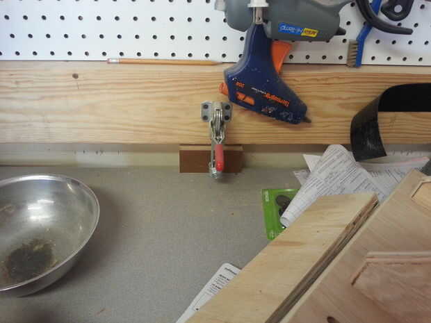 Añadí un pequeño trozo a la tapa de mi mesa y adjunta una abrazadera de palanca en la pared.