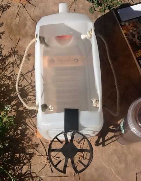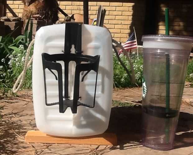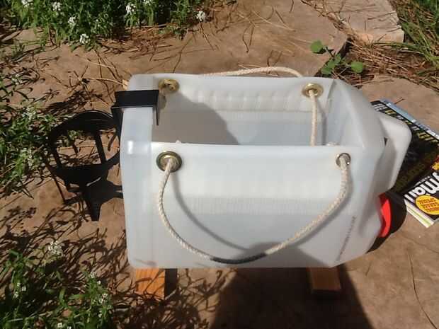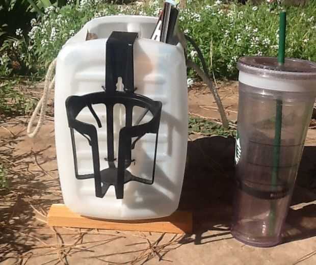 El cuerpo principal es un contenedor de basura de gato con algún jardín estacas clavados en el fondo. El sostenedor de taza es zip solo atado en que puedo utilizar en el coche otra vez si es necesario. Ojales se establecieron para los tiradores, o por lo menos 7/8ths. Tenga en cuenta a sí mismo, asegúrese de que ambos lados de la arandela antes golpeando a los diablos de IT.