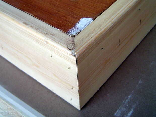 Tu 1 x 4 forman los bordes de la tabla, así que uno de los extremos de inglete y medir contra el borde de la mesa. Marcar y cortar con mucho cuidado, porque los ingletes son muy implacables. Si no tienes una ingletadora Sierra, un empalme puede ser más apropiado. Ensamble con cola para madera y brad clavador, como se muestra.