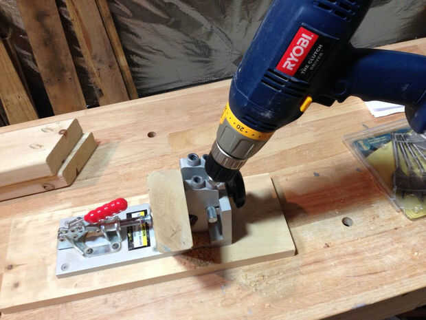 Coloque las secciones de fijación superior e inferior como se muestra. Usé una plantilla de pocket-hole para perforar los agujeros de conexión. Pensar en el futuro en este momento para asegurarse que los orificios en la parte inferior (piso) y debajo de la mesa. Agregue el pegamento a la articulación antes de atornillar juntos.