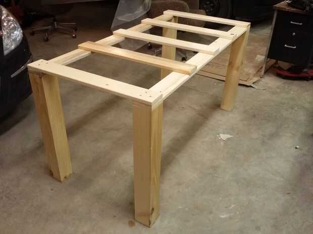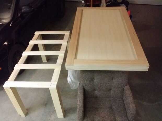 El armazón está hecho de knotty pine 1 x 4 y las piernas son knotty pine 4 x 4.