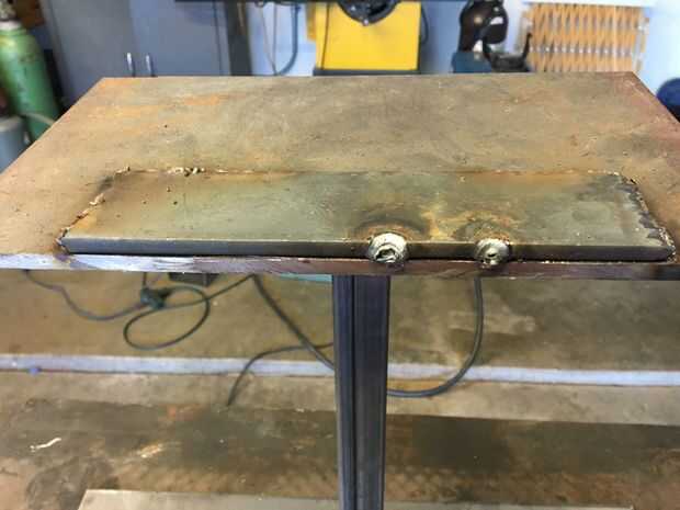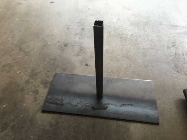 compré una pieza de acero hueco cuadrado en Home Depot. Mi vecino tenía un acero de desecho que usé para la parte inferior de la base. He alineado el acero cuadrado sobre la placa de acero y los soldados con autógena juntos.
