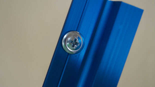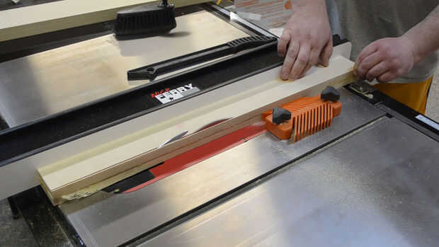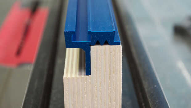 Después de que el pegamento se haya secado puede cortar la cerca al tamaño final. En mi caso 2 1/2" alto. La longitud final dependerá de su sierra y cuánto desea hacer el trineo. Iba a usar alguna protuberancia de aluminio para un sistema de riel en la parte superior de mi valla por lo que necesita un 3/4 "x 3/4" corte en un borde de la barbilla. He logrado esto con 2 pases en la Sierra de mesa. Como este es realmente bueno poder instalar accesorios, dejar de bloques y una medida exacta de la cinta para cortes repetidos. Mayoría de las personas opta por cortar con una sierra para metales de aluminio como esta. Me gusta usar mi sierra de inglete con una cuchilla de punta de carburo. Tómese su tiempo con el corte y carburo no tiene problema en pasar por aluminio. Después fue cortado a la longitud, previamente había perforado unos agujeros y lo instalamos con algunos tornillos.