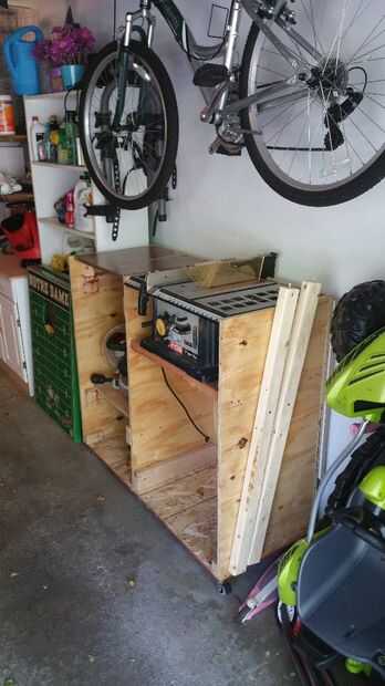 Recientemente se mudó a una nueva casa y como resultado ahora tenemos un garaje adjunto. Los agentes de bienes raíces lo llamaría 2,5 coches pero francamente apenas cabe 2,25 coches. De todos modos, con el garaje adjunto decidí subir algunas de mis herramientas desde el sótano. Lo hice principalmente porque aunque tengo un montón de habitación en el sótano, consigue madera o suministros hacia abajo puede ser un dolor y hace hace un desastre cualquier momento que corté madera. (Por alguna razón la esposa no le gusta serrín en la ropa recién lavada!) Con el escaso margen en el garaje que me decidí a construir una unidad que tanto mis ingletes Sierra Sierra de mesa, ser móvil, me da un apoyo extra para piezas largas y grandes y adaptarse muy bien a lo largo de la pared en mi garaje.