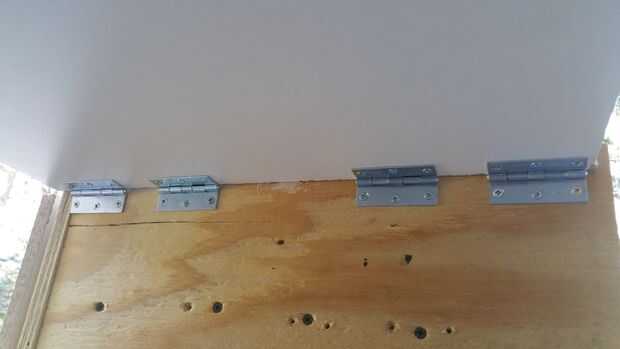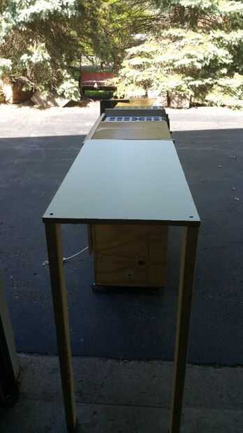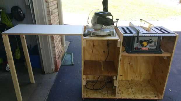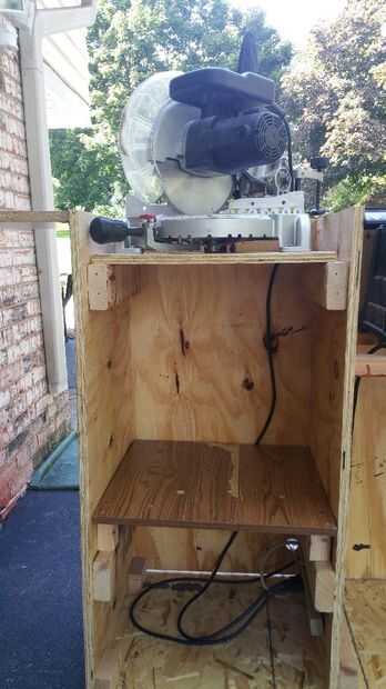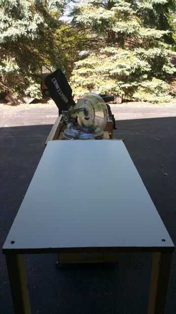 Aquí usted puede ver que tengo el inglete vio hacia arriba. La pieza blanca en el lado de la unidad se pliega para tener bastante espacio para cortar piezas largas de madera con el inglete vio. Simplemente subir y colocar las patas extraíbles se apoyo. Una vez que esté todo es lavar y nivel en la parte superior nos inglete vio. Las bisagras que sostiene la pieza lateral son bisagras básicas, que tenía los restos de otro proyecto.
