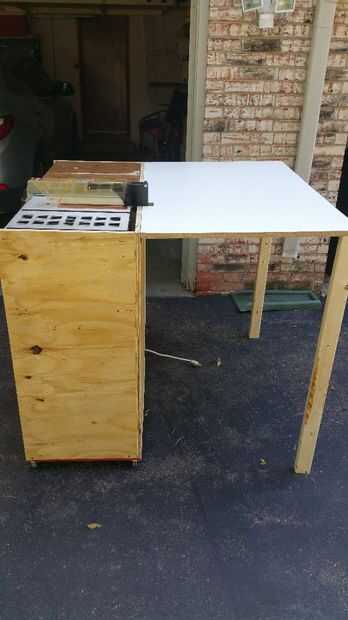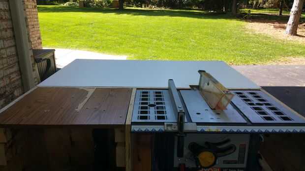 Cuando es necesario utilizar la tabla vio, simplemente mueva que la sierra hacia abajo y subir a la plataforma plana sobre el lado izquierdo. Luego levante la pieza adicional en la parte posterior y coloque las patas desmontables para apoyarlo. Ahora puede rasgar las piezas largas de madera!