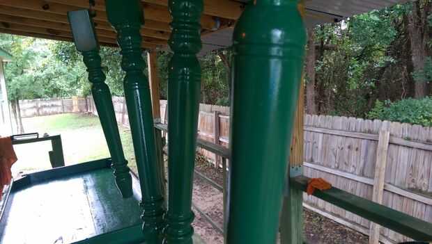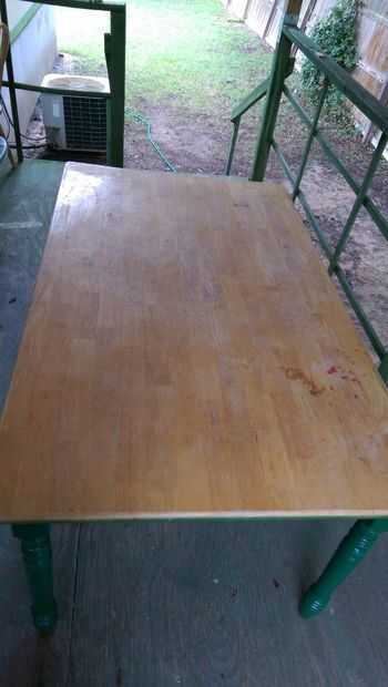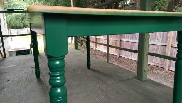 Pintar las piernas y parte inferior del tablero de la mesa. Asegúrese de obtener cobertura completa. (Para mí que tuvo 2 capas). Usted puede elegir para no pintar la parte inferior de la mesa, ya que nadie verá. Sin embargo, creo que la parte de abajo está sin sellar es lo que llevó a mi mesa ser deformada cuando fue dañada en la tormenta.