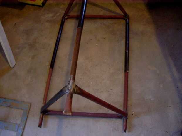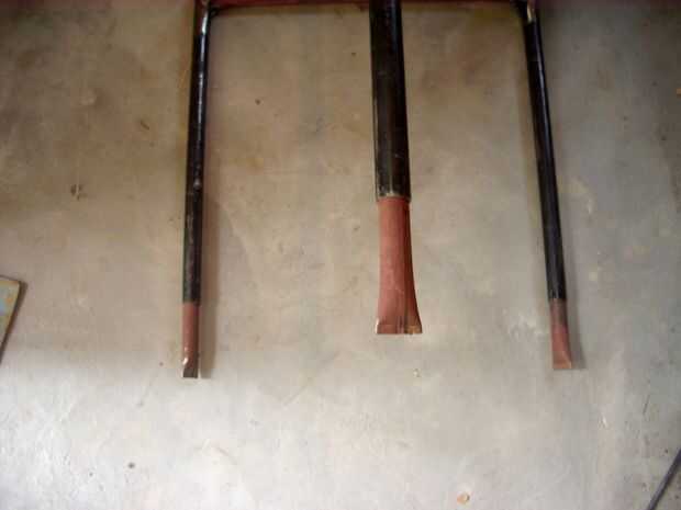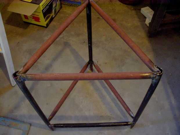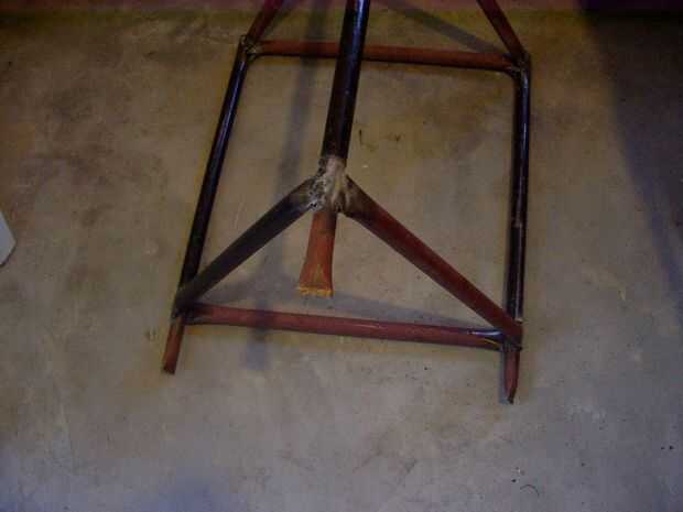 Cortar tres piezas de 50 cm de la tubería de 7/8, aplastó a un extremo con el martillo y visegrip (totalmente innecesario), a continuación, introdujo casi por completo dentro de tres patas de tubo de 1 pulgada, luego cortar tres piezas iguales de tubería de 1 pulgada, extremos aplanados con Morzan y el martillo y soldada a la tubería en forma de un triángulo equilátero. Aquí me di cuenta de que esta forma constructiva es mejor que lo que utilicé para la parte superior