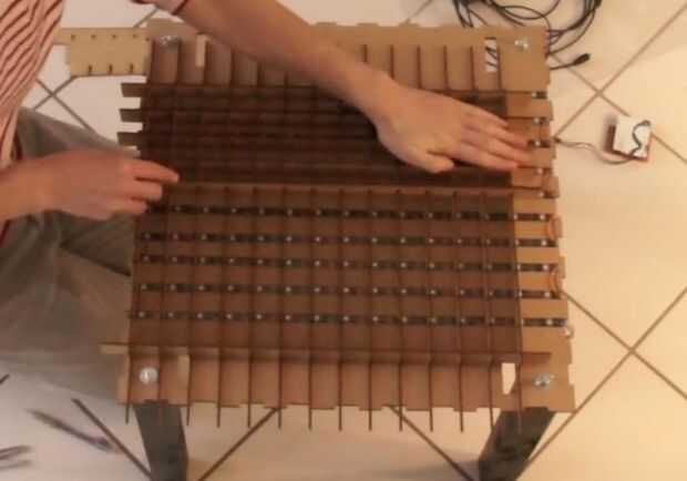 Finalmente gire la construcción final boca abajo para que los caminos secundarios son en la parte superior. Finalmente mover las rejillas en la bandeja de la tabla así que cada pixel ha creado las estructuras coincide con un LED.