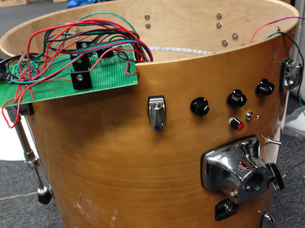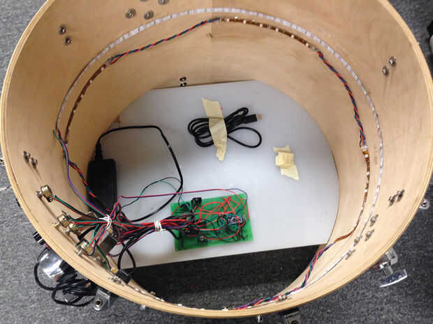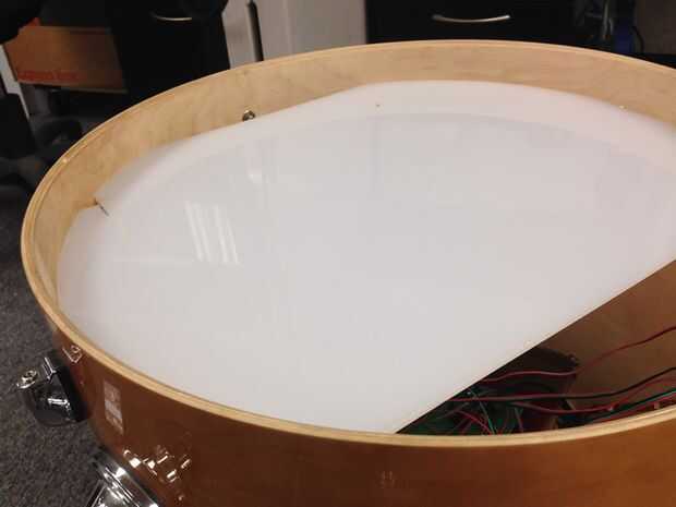 En esta etapa, los LEDs y elementos de la interfaz deben estar en el lugar. Como una fase opcional de este proyecto, puede crear una pieza de fondo para el tambor. Usted no necesariamente necesita, especialmente si el tambor estará sentado en un lugar durante mucho tiempo (y no utilizado como un instrumento) o quieres poner una piel en la parte inferior - en mi caso quería el circuito para ser de fácil acceso si necesita mantenimiento (que afortunadamente su nunca tiene hasta el momento).