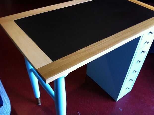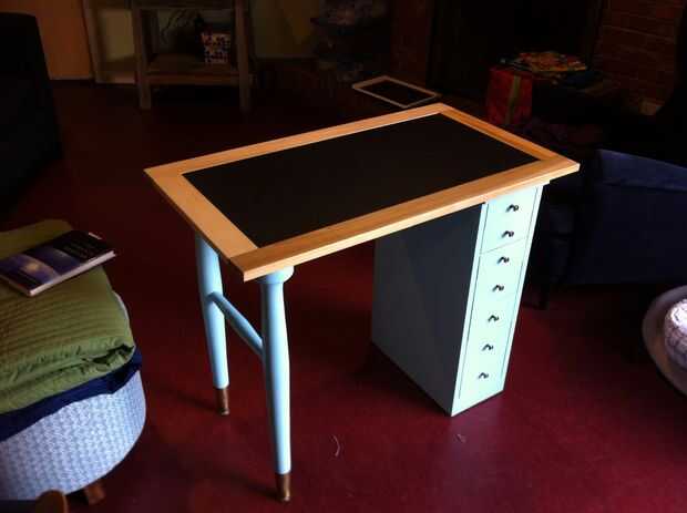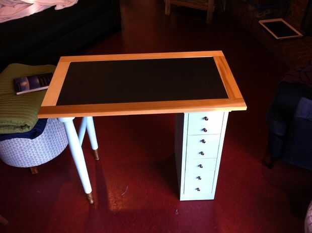 Ahí lo tienen! Un escritorio completamente nuevo de un escritorio viejo, anticuado y algunos materiales de desecho. Mi hija lo ama y ama en la parte superior de dibujo en tiza.