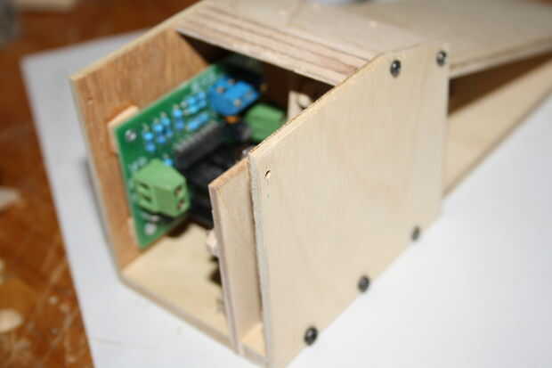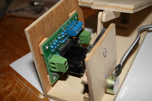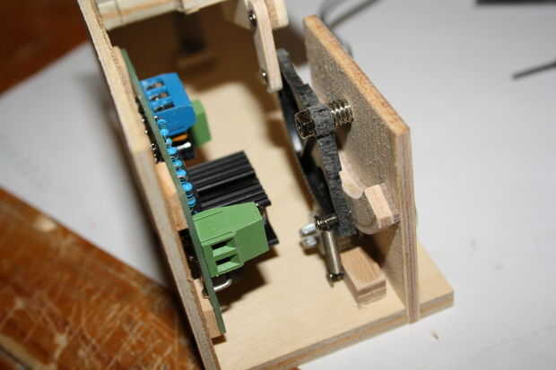 2 | A la derecha (enfrente de los engranajes) atribuimos el controlador del motor. Corté cuatro bloques de la esquina pequeña de chatarra. Colocar el regulador del motor en un lado, en lápiz donde quería el regulador del motor para adaptarse. Es importante dejar espacio para el lado que se unirá a la placa base en la parte inferior y dejar espacio para los cables que se conectan al controlador.