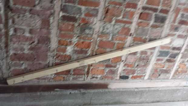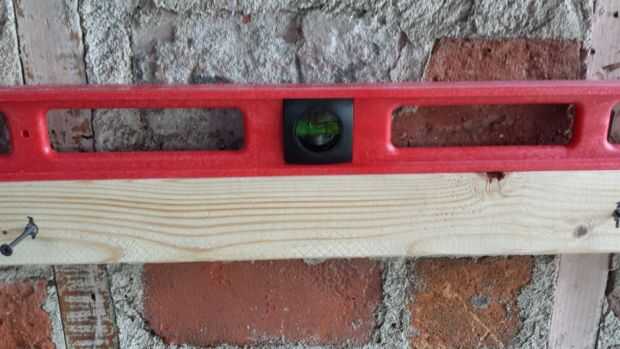 Hice sólo una marca porque mi piso no está nivelado, voy a atornillar un tornillo en el extremo derecho y luego levantar la izquierda con un nivel en él antes de atornillar en el lado izquierdo, así puedo asegurar que lo es.