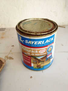 Que apliqué barniz sin teniendo cuidado de que a propósito, porque pensé que molaría algunas gotas. En una parte donde había un agujero y la hoja de madera era floja, fija la hoja con una grapadora (también porque parecía fresco).
