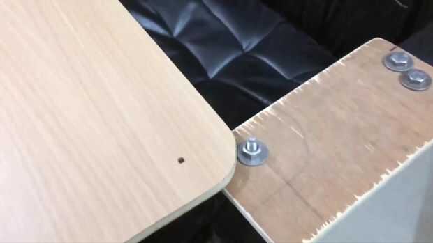 Nada de lujo, una L grande en forma de tablón de madera que gira sobre un solo tornillo, situado en la parte posterior. Para el bloqueo de la tabla en su lugar, he utilizado un tornillo que expulsa hacia fuera y entra en la pequeña cavidad de la misma madera.