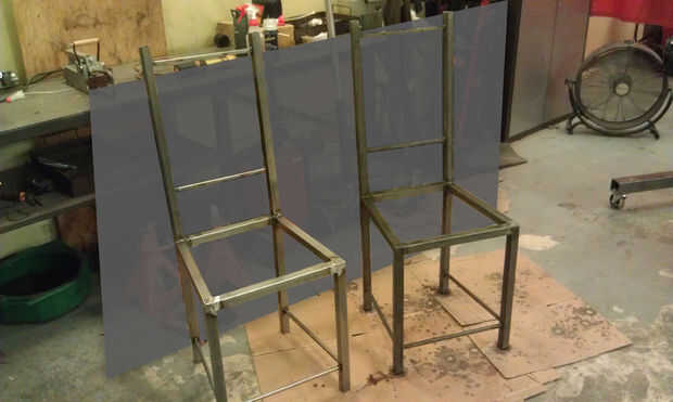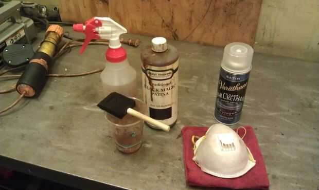 La pátina contiene óxido de hierro (no el reconstruccionada de olores) y el material teñido debe ser aclarado y secado a detener la reacción química. Seguimiento con poliuretano para evitar que se oxiden más. No quería que el acero para ser totalmente negro, apenas oscureció bastante que no fue tan brillante como el acero crudo.