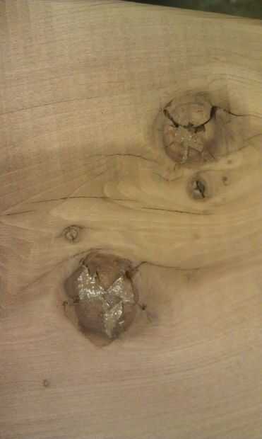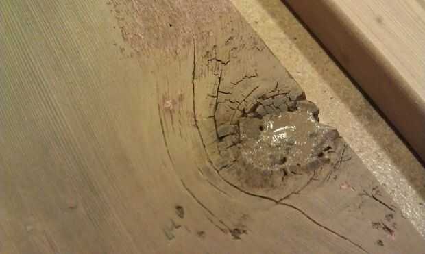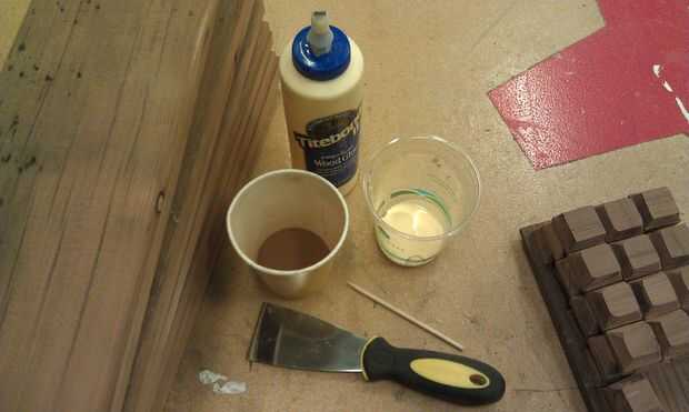 Para la madera, mientras que quería mantener las imperfecciones, ciertos nudos debían ser parcheado para evitar que se caigan más tarde. Uso el polvillo de la lijadora orbital coger bolsa como la base para cualquier relleno de madera. Comience con una cantidad abundante de pegamento para madera y añadir poco a poco el polvo de la sierra (revolviendo a medida que avanza) hasta que la pasta no es brillante.