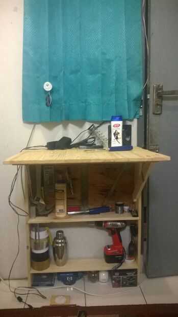 Tengo tantas herramientas ahí en mi habitación, y se necesita tanto espacio. Cuando mi amigo del espacio exterior, no puede dormir tranquilo porque mi habitación tan pequeña (cerca de 2.4 x 2.8 metros). Y otro problema, no tengo Mesa adecuada para hacer mi proyecto electrónico y estantes adecuados para almacenar mis herramientas.