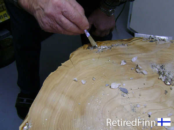 Ahora que los agujeros están llenos de rocas, usted tendrá que mezclar una pequeña cantidad de su barniz, para llenar parcialmente las áreas de roca (ver foto). Utilice un trozo de madera para obtener el barniz en las zonas de roca. No utilice un pincel en este paso ya solo moverá todas sus rocas por los agujeros!