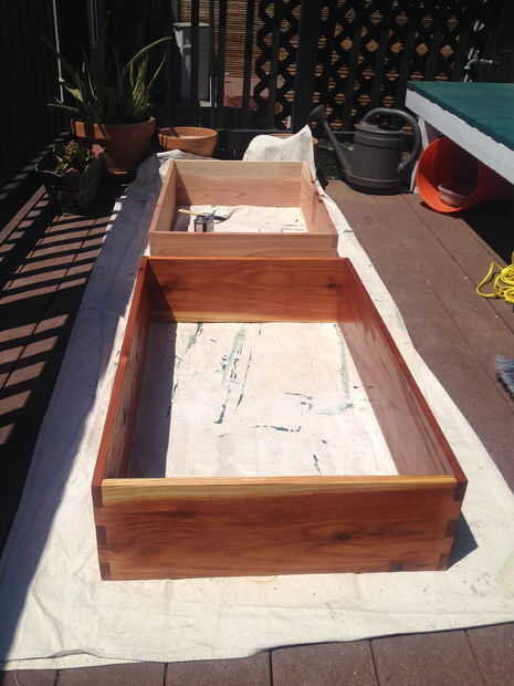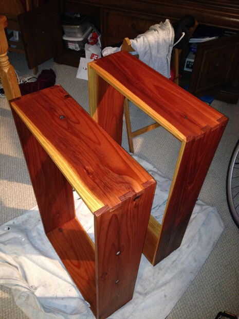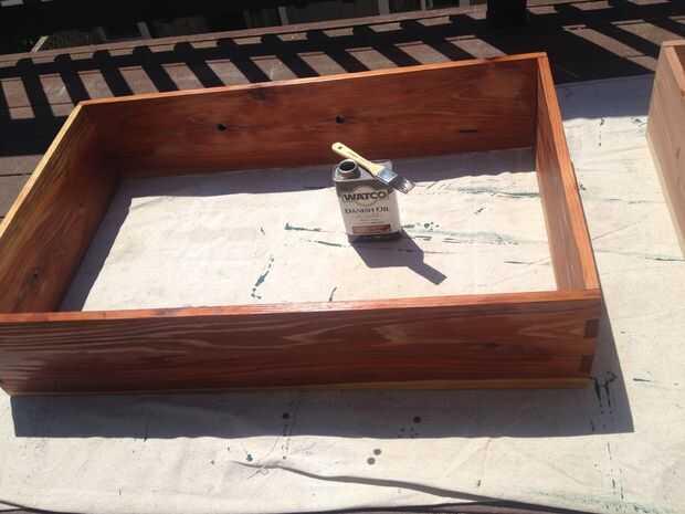 La hora de elegir un acabado, piensa en cómo se utilizará su pedazo de muebles, lo que se colocará en, si será dentro o etc... Un acabado de muebles muy populares es aceite danés. Aceite danés es principalmente aceite de linaza, una muy pequeña cantidad de barniz y un solvente como espíritus de mineral. El solvente lleva el aceite y el barniz en la madera donde se seca. Múltiples capas pueden ser aplicados sin lijar entre capas. Finalmente puse cuatro gruesos abrigos de aceite danés en los tableros. Permiten una media hora para que el aceite en remojo, luego limpie el exceso con un trapo limpio y sin pelusa. Puedes ver cómo saca el grano en la primera foto y la comparación de lado a lado. Técnicamente creo no deben aplicar aceite danés de luz directa del sol o "parpadeará," lo que significa el solvente se evaporará demasiado rápido, dejando el aceite en la superficie, en vez de absorbido por el grano. Simplemente elegí la tarde en un día un poco menos soleado y parece trabajar bien. Dejar completamente seco sobre 5-8 días. Puede tocar la superficie realmente en cualquier punto y no te preocupes deja estampados o rayas en el acabado. Esto es muy indulgente para alguien que nunca ha trabajado con cualquier acabados antes.
