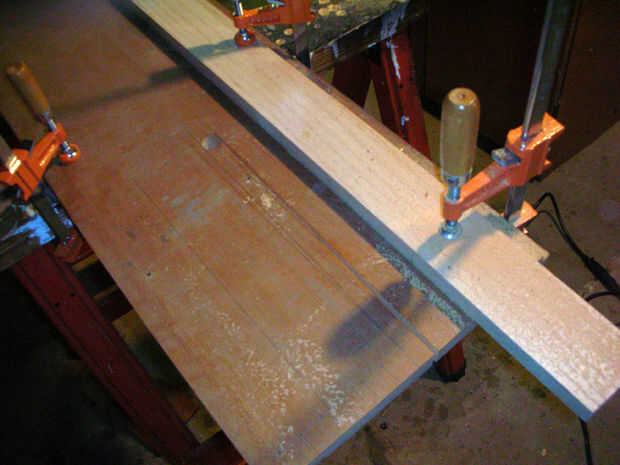 Para asegurarse de que los extremos son cuadrados y planos, use una escuadra para hacer una línea perpendicular de la parte de atrás de la madera. Medida 1-1/2" de esa línea y reprimieron un pedazo de madera para servir como una guía para la sierra circular.