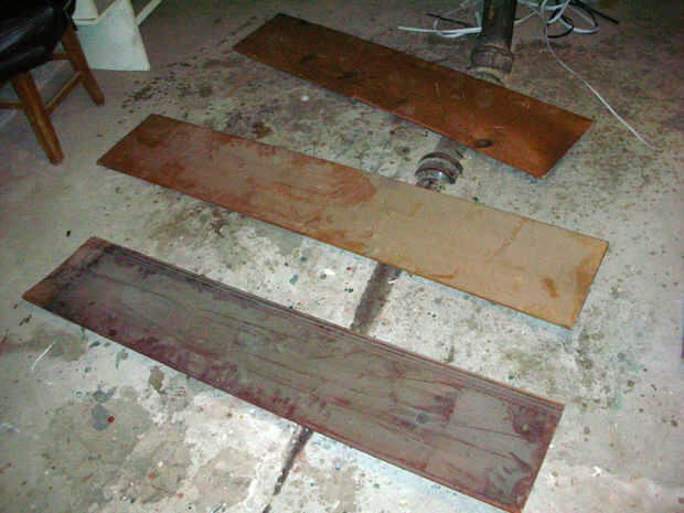 De la tabla más grande, medir una línea de centro en la placa más larga de principio a fin. De esa línea central, realizar un corte 3/8" a cada lado de ese centro y 12" de largo, para hacer una ranura de 3/4" en el tablero. Utilizar una 3/4 broca para redondear el fin de los cortes. Repita en el otro extremo. Hacer lo mismo en cada uno de los dos tableros más pequeños, de sólo un extremo, teniendo cuidado de orientar las ranuras para que la moldura esté intacta todo el camino alrededor de la parte delantera de la tabla final.