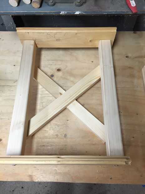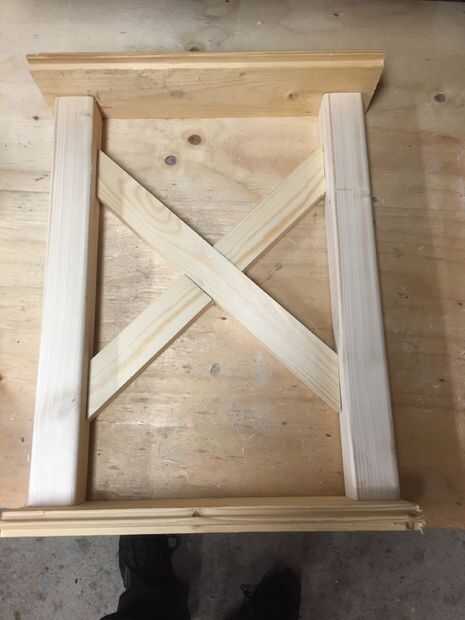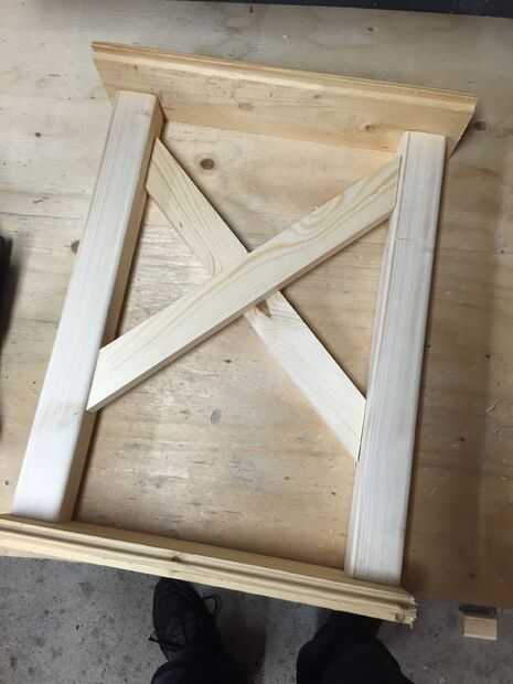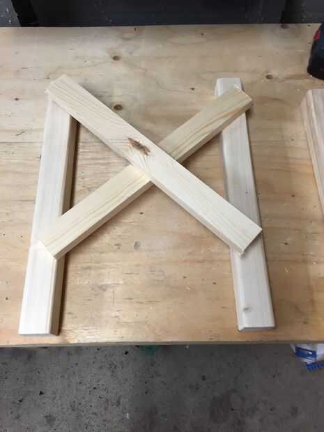 Quería la tabla que tiene una cruz en la espalda, así que utilizado dos tableros pequeños y medido por ponerlos debajo de las dos patas traseras. Para hacerlo más preciso he arreglado las piernas con dos tablas para que no y mantienen la misma distancia mientras los medí.