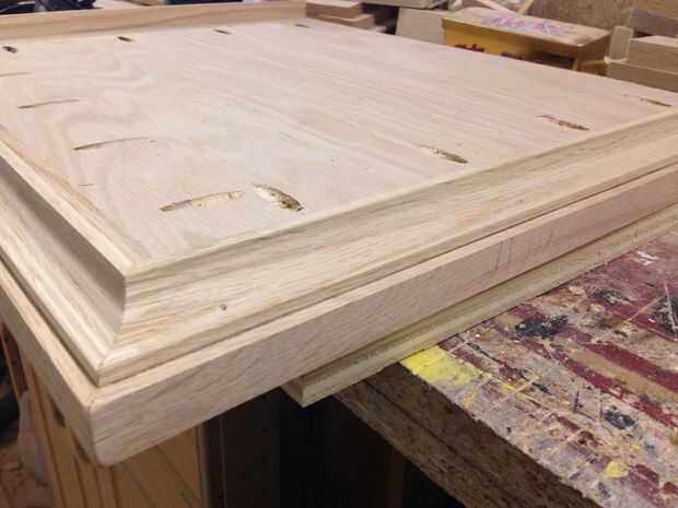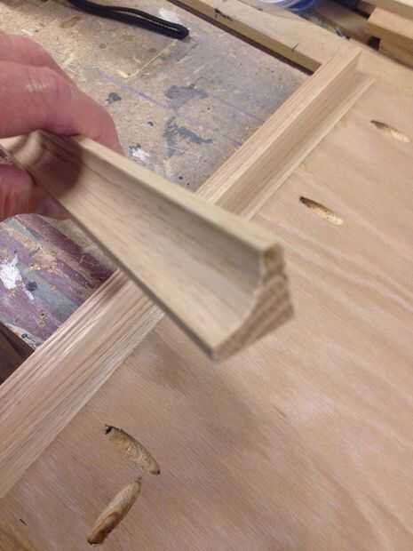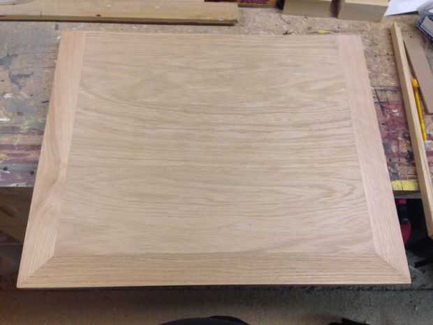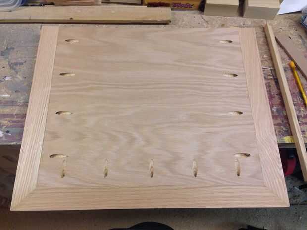 Empecé el proyecto con la construcción de la parte superior. Envuelve la frente y los lados de 18 1/2 pulgada x 16 1/4 de pulgada 3/4 de pulgada chapa roble madera contrachapada con 1 x 2 madera maciza de roble, inglete las esquinas delanteras. La madera dimensional utilicé mide 1 3/4 pulgadas x 3/ 4 pulgadas y es de una tienda de carpintería local cerca de mi casa. Esto es un poco más ancho que las piezas que puedes conseguir en las tiendas grandes de la caja. Aseguró la madera maciza de roble a la madera contrachapada con tornillos cola y bolsillo en el ángulo agujeros que hice con el sistema de agujero de bolsillo Kreg jig. El acabado superior es 22 pulgadas de ancho x 18 pulgadas de profundidad. Adornos de una moldura de Caleta de 3/4 de pulgada hacia fuera la parte superior. Inglete las esquinas delanteras y encolados/clavados revelan las piezas laterales a la parte superior dejando un 1/4 de pulgada. No fijar la Cala en la parte delantera como se trata de parte del frente del cajón oculto.