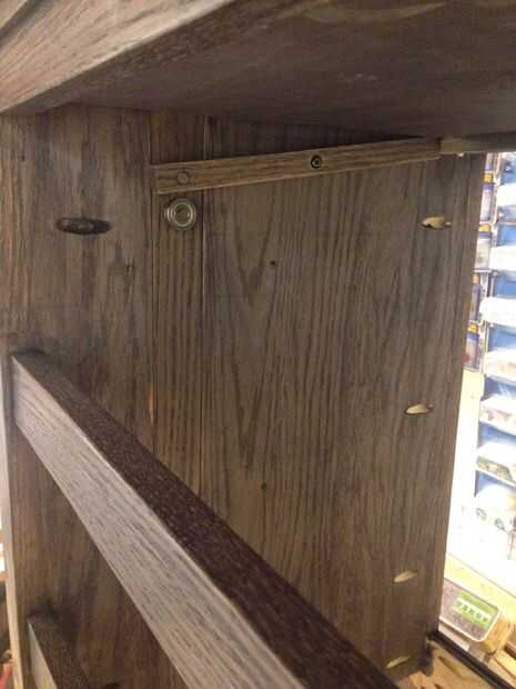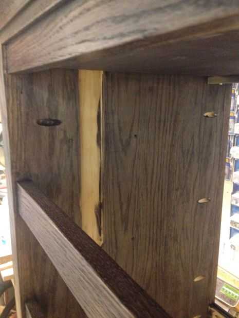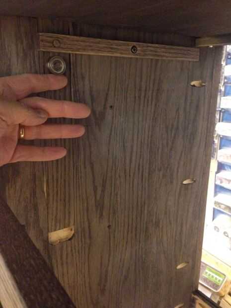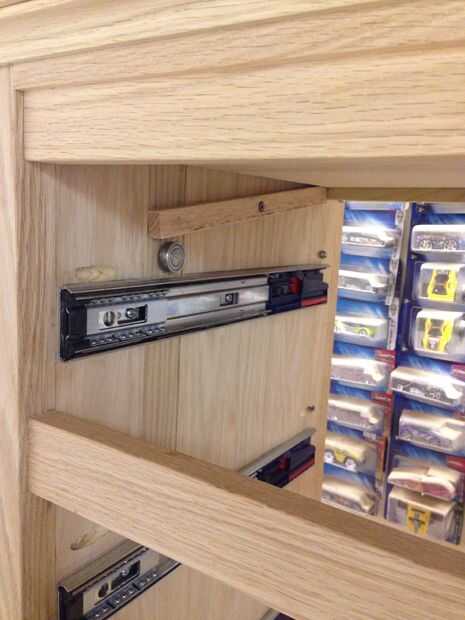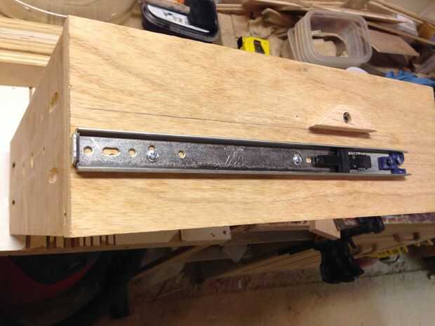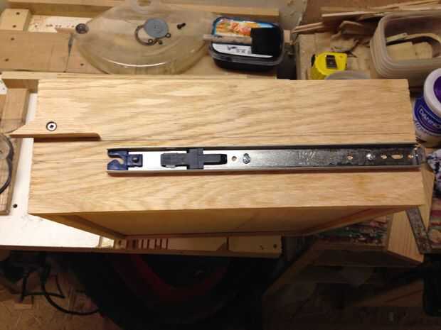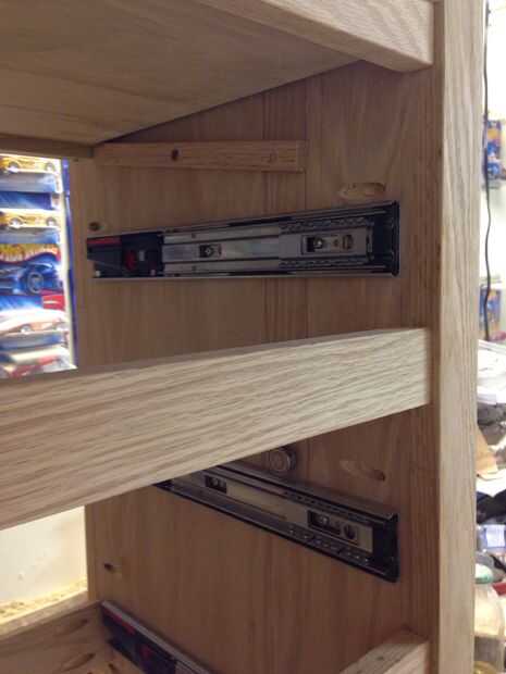 Quería que el mecanismo de bloqueo para ser simple y puramente mecánico sin resortes o cables. El diseño que surgió utiliza nada más que algunas palancas, cojinetes y gravedad. Para construir la cerradura empecé cortando ranuras en el interior de la pulgada de 3/4 lados de madera contrachapada (como se menciona en un paso anterior). Las ranuras son 1 1/2 pulgada de ancho x 1/4 de pulgada de profundidad y cerca de 12 pulgadas se extienden hacia abajo desde la parte superior. Esta ranura permite un 1/4 x 2 x 10 pulgadas pedazo de roble para sentarse a ras dentro del canal. Las mejores correderas 2 mantendrá el 1/4 x 2 de caer hacia fuera. Taladré un agujero de 5/16 de pulgada en el 1/4 x 2 roble justo por encima de la diapositiva del cajón superior de la izquierda y justo por encima de la segunda diapositiva del cajón de la derecha. Luego pegué en un 5/8 de pulgada largo 5/16 espiga de roble de diámetro en el agujero. He pulsado sobre unos rodamientos que había recogido de un viejo conjunto de patines que encajen firmemente sobre los tacos. También perforé un agujero de 3/8 de pulgada en el 1/4 x 2 a 4 pulgadas hacia abajo desde la parte superior. He atornillado y pegado una grapa de 1/2 pulgada en la parte inferior del cajón escondido en el borde posterior de la caja del cajón... Luego utilicé una pieza de roble de 3/8 de pulgada para actuar como una cuña en el Cala de cajón ocultas. Perforado y pegado un pasador de 5/16 de pulgada en la cuña a la línea de arriba con el agujero que antes había perforado en el 1/4 x 2. Contador hundido y atornillar la cuña a la tabla interior mediante tornillos con un collar suave cerca de la cabeza para que las cuñas pueden girar libremente. El peso de 1/4 x 2 y el cojinete mantienen la cuña en la Cala de cajón. Trapecio pequeño en forma de leva atornillada en el lado izquierdo de la gaveta superior y lado derecho del segundo cajón elevará momentáneamente el rodamiento causando la cuña caer lejos de la Cala. Donde la leva se monta en el cajón determina cómo colocar el cajón para el desbloqueo.