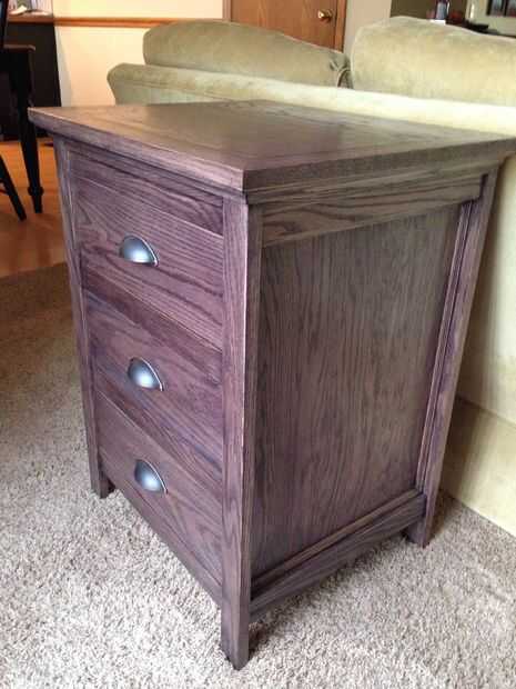 Empecé lijando la mesa con papel de lija de grano 150 y siguió con grano 320 hasta que todo fue suave. Lija es que mi parte menos favorita del proyecto aunque me encanta la sensación de un pedazo de madera después de a se ha trabajado con alguna lija fina. Después de quitar el polvo con un trapo pegajoso apliqué una capa de 1 parte General acabado ébano tinte mancha mezclado con 3 partes de su Natural de la mancha. Esta combinación dio las mesitas de noche un gris/negro, casi buscando la final. Estos tintes/manchas son agua y fácil de trabajar. Que seca rápido y sin olor, sin embargo, porque son a base de agua subir el grano en algunas áreas. Alisaron estas lijando suavemente las áreas con papel de lija muy fino. A continuación, añadí 3 capas (con ligero lijado entre capas) de General acabados satinado Top Coat para proteger el tinte y darle cierta profundidad a base de agua. El último paso del proyecto fue instalar el cajón tira