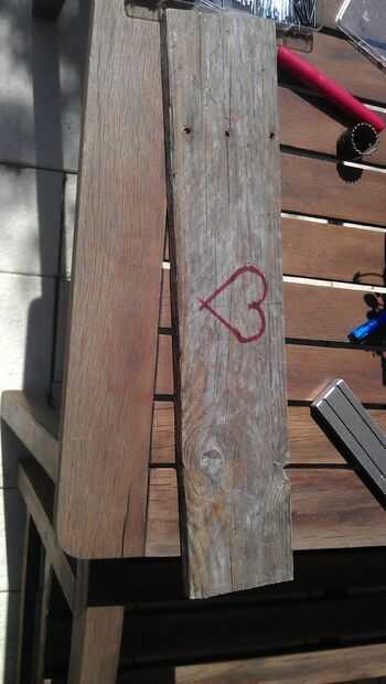 -En segundo lugar dibuja la figura de corazón correcto que usted desea. Usé una sierra (32mm). (Siempre utilice un lápiz y definitivamente no un rotulador. Se consigue en la madera y es muy difícil fuera de la arena).