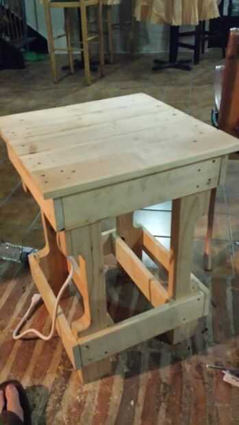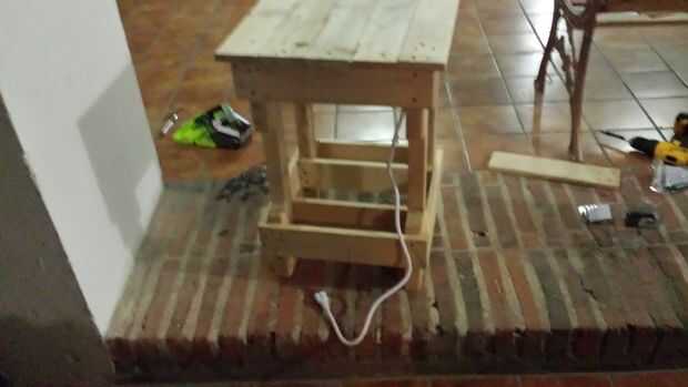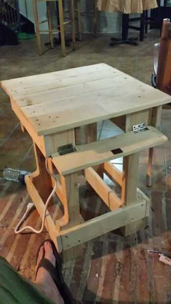 El cable de su tira de energía recién montados se equilibre en la parte trasera de tu mesita de noche. Tiempo para conectar la parte final, que es también la puerta del compartimiento de secretos. La pieza de madera C * opté por usar tenía los agujeros de los clavos utilizados para sujetar a la plataforma. Esto es algo bueno, porque después de llenar los agujeros, lijar y lo coloración parecen fijarse a la mesa final al igual que los otros 3 lados.
