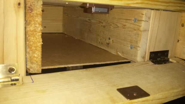 Así que originalmente iba a usar la balsa madera o algo más que 1/4" para la plataforma, pero la tienda de hardware local caja grande no tiene las hojas para la venta estaban debajo de 4 'x 8'. Así como un reemplazo, fui a la sección de alimentación de la escuela de mi farmacia local y comprar legal tamaño madera portapapeles. Porque este portapapeles es un poco más de un tablero de tamaño estándar funciona perfecto para el estante. Recortar uno de los lados para caber debajo de los soportes del interiores de su mesa. En cuanto a la longitud, que desea alinear el lado opuesto no al ras con la pared posterior. Si haces esto será visible desde el lado de la mesa. Por el contrario desea montado justo cuando llegue a la pared detrás (se puede ver lo más mínimo de vacíos si se mira cerca en la segunda foto). La parte delantera depende de lo gordo o flaco los dedos son. Usted tendrá que dejar un espacio como este es la única manera que podrás abrir la puerta secreta sin fijar un mango... que derrotaría el propósito entero. Creo que dejó un hueco de 1.5" en la mía. Madera pega los lados y Monte el estante con varios tornillos de madera. He utilizado 5 por cada lado.