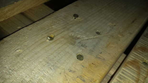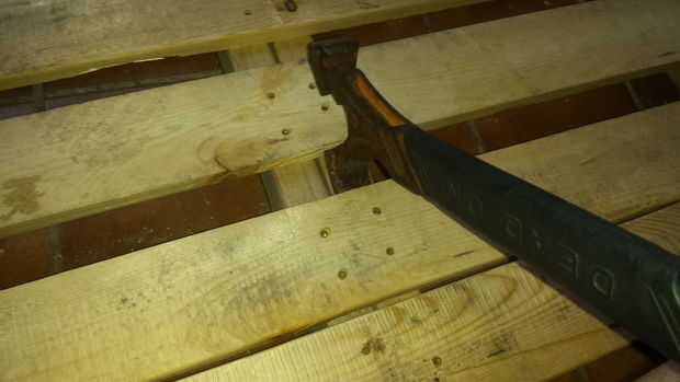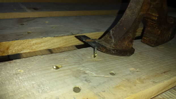 El centro de la plataforma es generalmente el punto más difícil. Encontré bastante fácil de obtener la garra de mi martillo debajo de la tabla y con un pequeño apalancamiento los tableros separará. Dar el tablero superior un golpe rápido en el centro y debería de poder acceder a la mayoría de las uñas enterradas.
