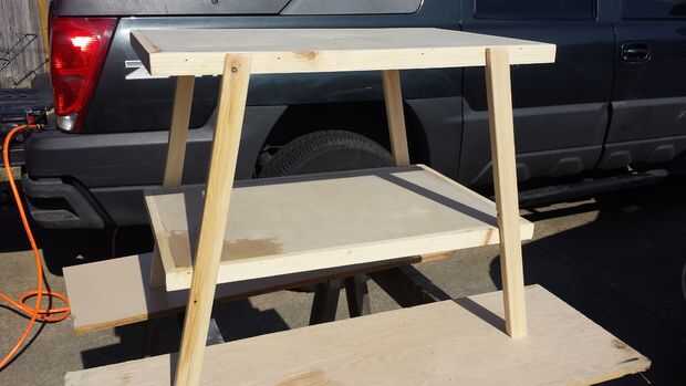 Tuve un 1 x 6 en el cobertizo que cortar a la altura correcta. Entonces comencé a trazar ángulos y alturas que me ha gustado. Establecidas dos pedazos en el suelo y me sujeta las tapas de la superficie en diferentes lugares. Una vez que los ángulos que me ha gustado, debatí sobre las opciones de montaje. Quería mantener los sujetadores a un mínimo. Por lo tanto, me decidí por ranuras de corte en las patas de apoyo. Usé un calibrador de biselado para averiguar los ángulos.
