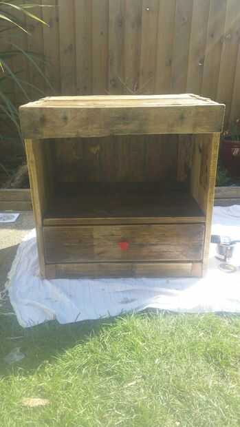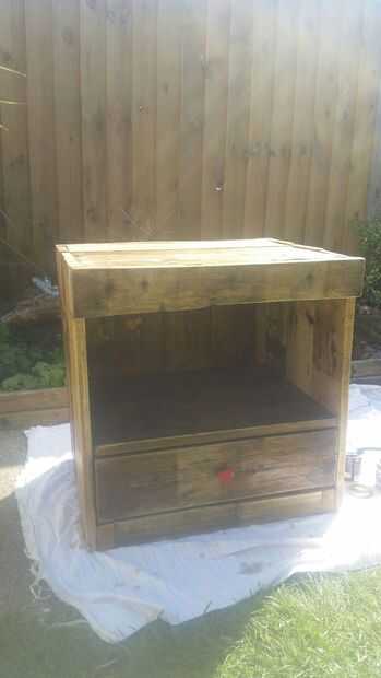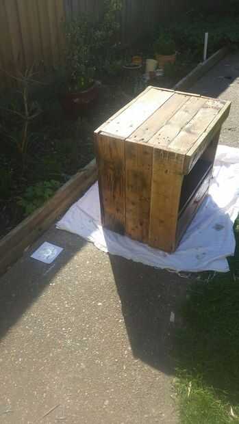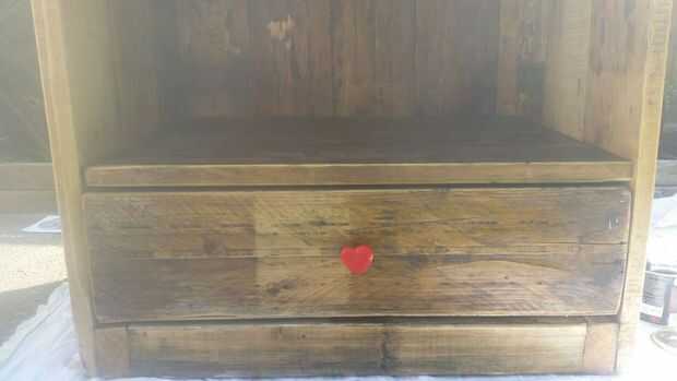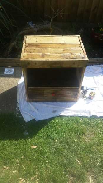 he encontrado esta idea en instructables así que lamentablemente no puede tomar el crédito por la idea, realmente disfruté de este edificio. No tengo ninguna foto a través del proceso pero dinero no se gastó en ella en todo! Aparte tomé 2 paletas ya tenía en mi jardín y el barniz que ya tenía. Si usted está buscando las instrucciones este solo comentario y mala respuesta con instrucciones o dejo el link a la idea original que encontré en aquí